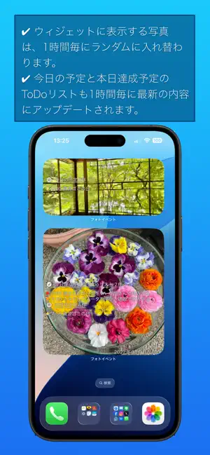 写真アプリのお気に入りのフォトアルバムに保存されている思い出の写真を、iPhoneやiPadのホーム画面にウィジェットとして掲載するアプリです。お気に入りのフォトアルバムに保存されている写真とともに、今日の予定と今日達成予定のToDoリスト、掲載している写真の撮影日時などを表示することが可能です。