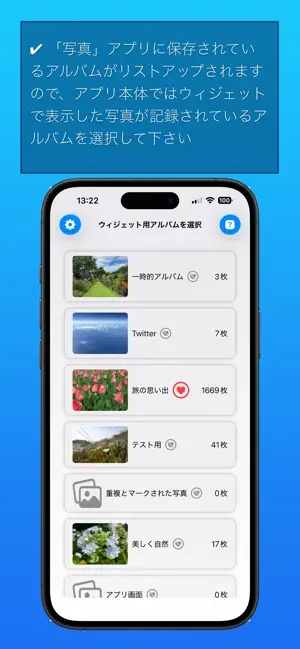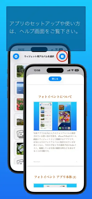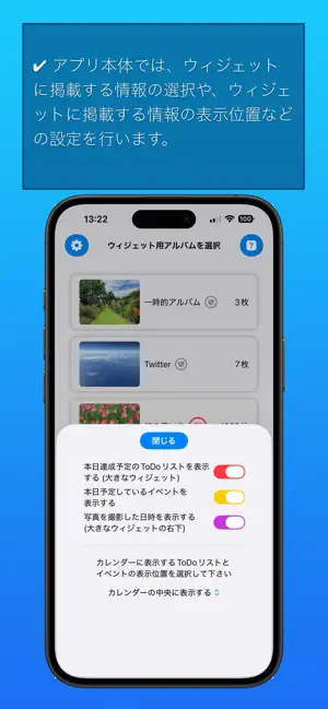 ・ホーム画面のウィジェットに掲載する写真やウィジェットに掲載する情報などは、アプリ本体で設定します。