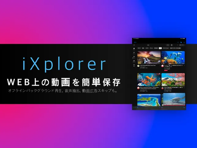 iXplorerはウェブ上の動画を保存、オフラインバックグラウンド再生ができるシンプルな軽量ウェブブラウザです。