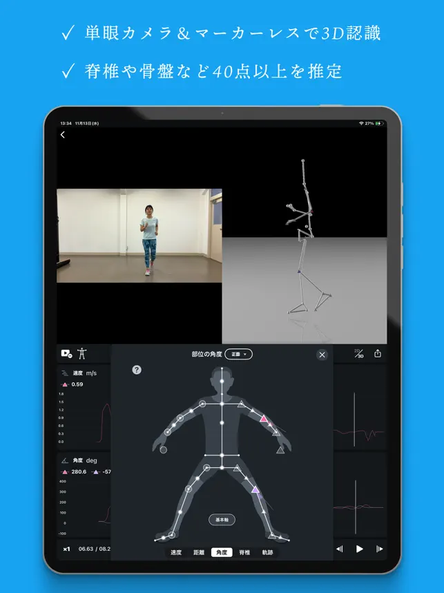 カメラ1台&マーカーレスで3D動作分析が出来るモーションキャプチャアプリです。