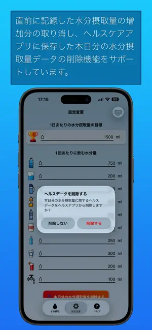 直前に記録した水分摂取量の増加分の取り消し、ヘルスケアアプリに保存した本日分の水分摂取量データの削除機能をサポートしています。