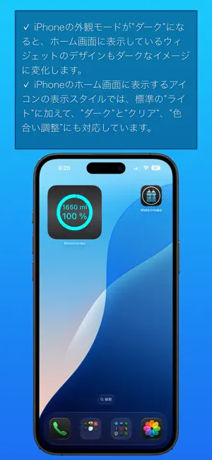 アプリ本体の”本日の水分摂取量"画面の内容と連動したホーム画面とロック画面のウィジェットをサポートしています。