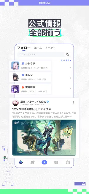 HoYoLABは色んなゲームの公式情報やイベント、実用的なツール、プレゼント配布に加え、ファン作品を公開する場などを提供するプレイヤーコミュニティです。