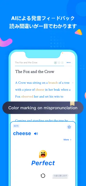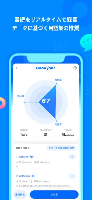 英語原文の書籍や記事を声に出して読むと、AI音声認識テクノロジーが発音を分析し、改善を支援します。また、標準的な正しいオリジナルの英語音声を聞き、真似をして覚えることもできます。