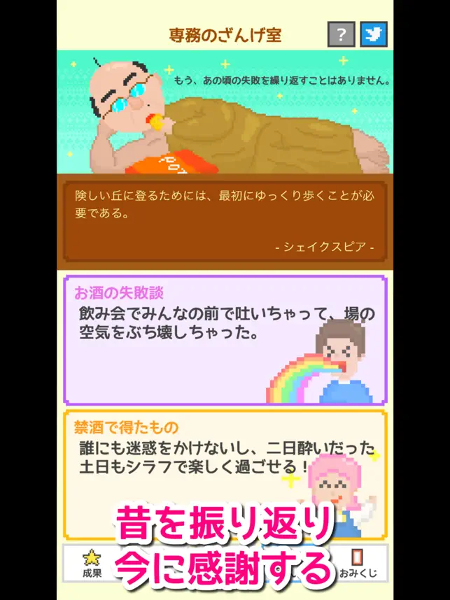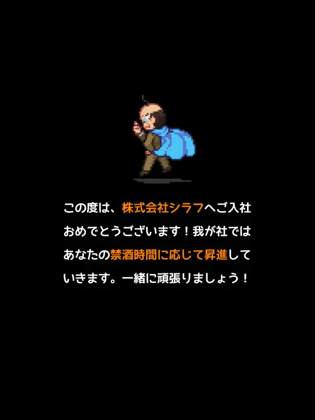 あなたは株式会社シラフの社員!禁酒時間に応じてドット絵のサラリーマンが出世していきます。迫り来るテビールの誘惑に打ち勝ち、夢の会長職を目指そう!