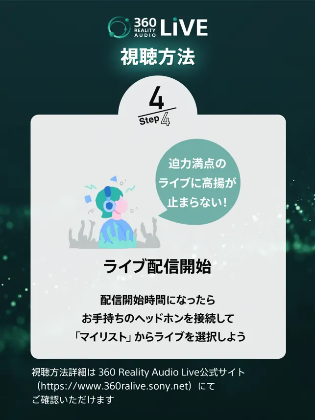 360 Reality Audio Liveは、ソニーの360立体音響技術を用いたライブ配信を楽しむ新しいオンラインサービスです。ソニーとStreamsoft inc.が開発した360 Reality Audio Liveアプリにより、リアルタイムでの配信や過去のライブコンサートがまるでライブ会場にいるかのような臨場感で体験できます。視聴可能なライブコンテンツは「360 Reality Audio Live公式サイト(https://www.360ralive.sony.net/)」にてご確認いただけます。お持ちのスマートフォンとヘッドホンでどこでも手軽にお楽しみいただけます。リアルタイム配信時にはアーティストと視聴者、視聴者同士によるリアルタイムコミュニケーションも可能です。