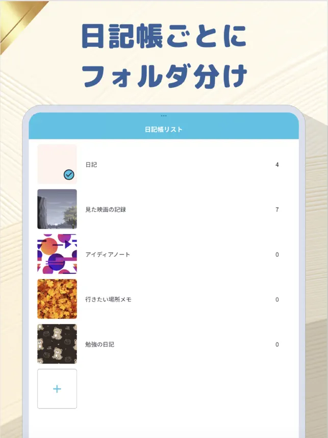 勉強、旅行の記録、音楽の歌詞、創作ノートなどカテゴリごとに日記帳を分類できます。