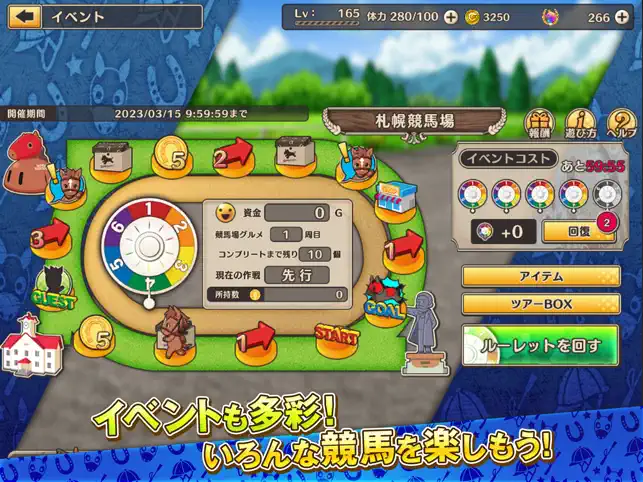レースに出すのに体力がかなり削られますが、今のイベント(ターフツアー)は別途時間回復賽子みたいなもの(ルーレット)を消費して遊べるので、割と楽しんでいます。