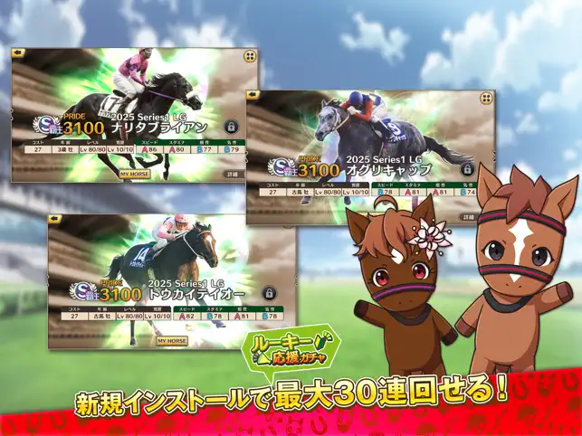 今なら新規インストールで『ナリタブライアン』や『トウカイテイオー』、『オグリキャップ』などの人気馬が狙える『ルーキー応援ガチャ』が最大30連無料!