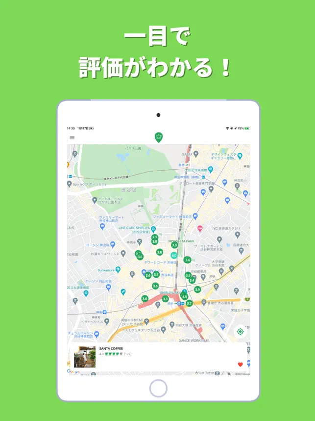 ・カフェの評価がマップ上に表示されます。