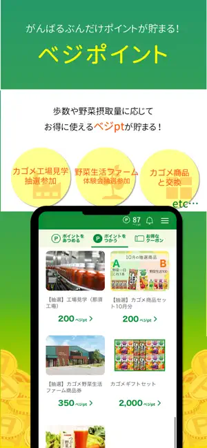 ・アプリでの活動に応じて、アプリ内でお得に使えるベジポイントが貯まります!貯まったポイントで、カゴメ商品との交換や、工場見学・野菜生活ファームへで使える商品券抽選等へ応募できます。