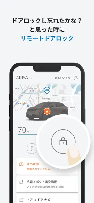 - 便利だが、痒いところに手が届かない 基本的に不具合もなく、自車位置、充電残量、施錠の確認には非常に便利。オドメーターの確認もできるのは任意保険の更新の際などに地味に便利。リモートでエアコンをオンにできるのもありがたい。アプリからはドアロックの施錠のみしか出来ないが、セキュリティの観点上解錠には非対応なのもよく考えられている。