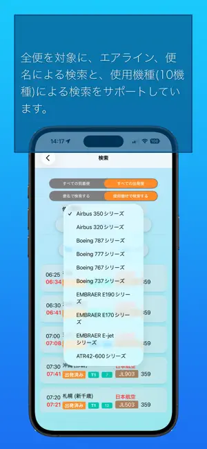 全便を対象に、エアライン、便名による検索と、使用機種(10機種)による検索をサポートしています。