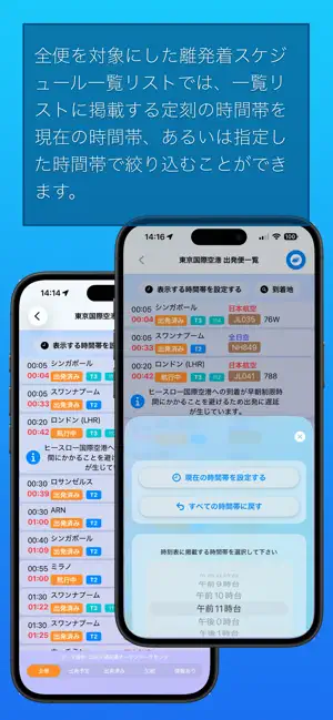 全便を対象にしたフライトスケジュール一覧では、定刻の時間帯を対象にした検索をサポートしています。