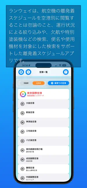 ランウェイは、航空機の離発着スケジュールを空港別に閲覧することは勿論のこと、運行状況による絞り込みや、欠航や特別塗装機などの検索、便名や使用機材を対象にした検索をサポートした離発着スケジュールアプリです。また、各空港の航空気象や出発地や到着地の天気予報を確認することも可能です。
