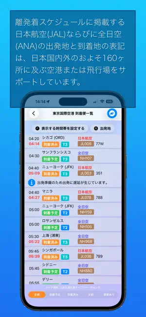 離発着スケジュールに掲載する日本航空(JAL)ならびに全日空(ANA)の出発地と到着地の表記は、日本国内外のおよそ219ヶ所に及ぶ空港または飛行場をサポートしています。