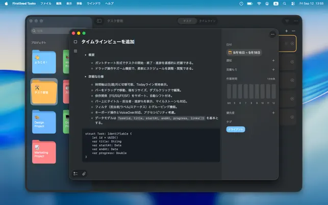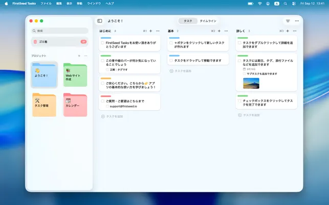 他にも視覚的に管理できるボード、予定と並べて整理できるタイムライン、最適な進め方を提案するAIアシスタント、そしてFirstSeed Calendarとのシームレスな連携を実現。タスク管理に必要なすべてがこのアプリに搭載されています。