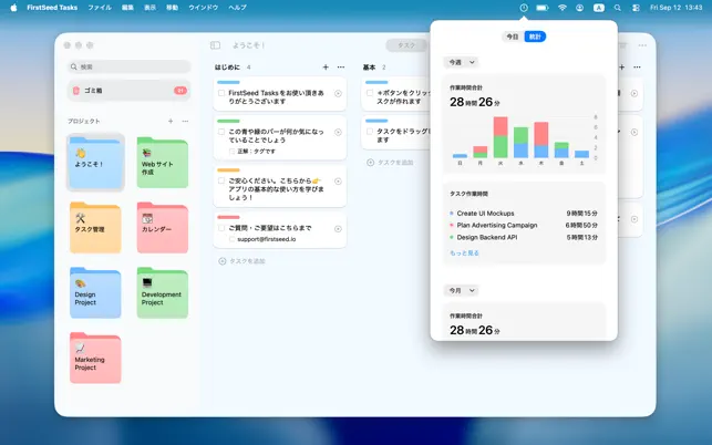 欲張りですが,タイムトラッキング(タイムログ)が取れるような機能もあると,FirstSeedのアプリだけでタスク管理,スケジュール管理,タイムトラッキングができて便利だなと思います。