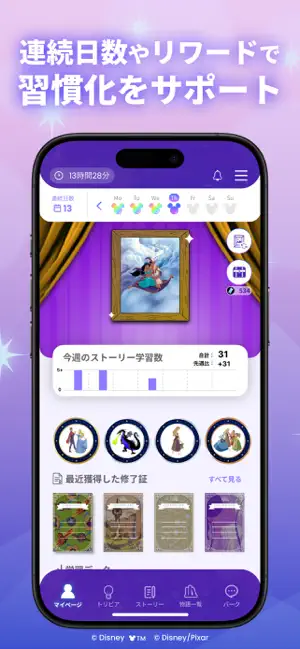 また、物語を最後まで学んだり毎日欠かさず学習を続けることで、ディズニー作品やピクサー作品の素敵なデザインの修了証を獲得できます。