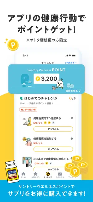 サントリーウエルネスのサプリ・スキンケアのオトク継続便契約者様は、Comadoのチャレンジ達成でもサントリーウエルネスポイントが貯まります。