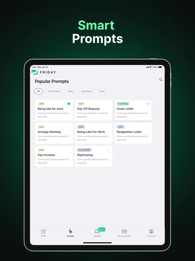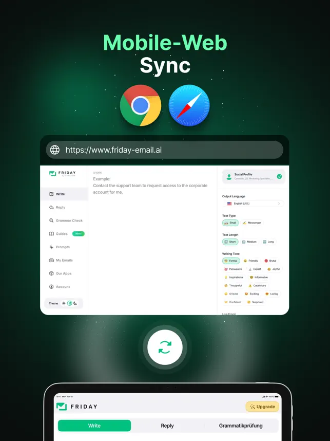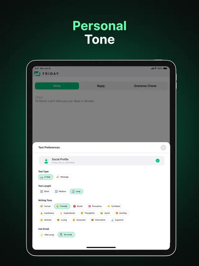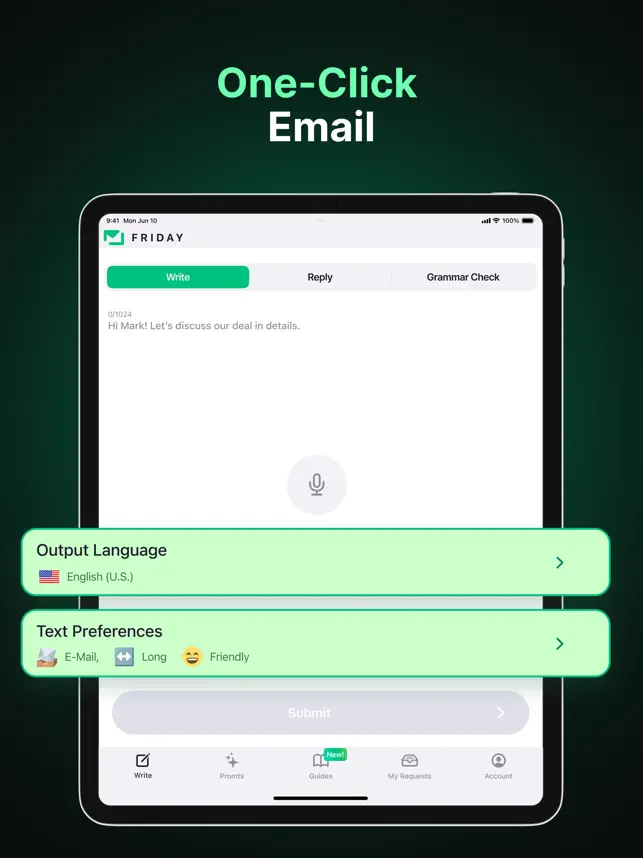 操作は非常にシンプルで、アプリを開き、テキストを入力またはペーストするか、音声リクエストを録音するだけで、あとはFridayに全てお任せください。わずか数秒で、自然で、ミスのない自然で人間味のある文章ができあがります。本アプリを使用して日本語のみならず、英語を含む世界中の言語でメールを作成することも簡単に。