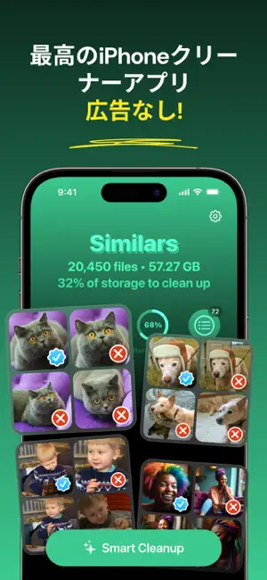 * 大容量ファイルクリーナー 最も容量を占めているファイルを素早く特定し、削除可能。ファイルをサイズ順に並べ替え、必要なものを選別。 * Live Photos管理 ストレージを圧迫する大きなLive Photosを特定し、圧縮してスペースを解放。 * 新機能!スワイプモード:写真の整理が簡単・スピーディーに。左にスワイプで削除、右にスワイプで保持。写真は月ごとにグループ化されており、見逃すことがありません。AIに任せるより自分で選びたい方に最適です。重複写真だけでなく、すべての写真が表示され、自分で完全にコントロールできます。 * 新機能!動画圧縮:自分に最適な圧縮レベルを選択 – 共有を素早く行うには軽め、最大限の容量節約には強めを選べます。 2025年のiPhoneで重複写真を削除する方法 1. Clever iPhone Cleanerアプリを開く。 2. 自動スキャンが完了するまで待つ(1~5分)。 3. [スマートクリーンアップ]をタップ。 4. 完了! Clever Cleanerの主なメリット * iPhoneストレージを最適化: ストレージの無駄を減らし、iPhoneを効率的に保つ。 * ストレージ不足解消: 「iPhoneストレージがいっぱい」の警告にさようなら! * 不要ファイルの削除: 必要ないファイルを簡単に整理してギガバイト単位でスペースを解放。 * 重複写真の削除: AIを使ってギャラリーを整理。 Clever Cleanerは以下の問題を解決 * iPhoneのストレージを解放する方法: 重複写真クリーナーでスペースを節約。 * iPhoneのスペースをクリアする方法: 不要ファイルや大きなLive Photosを素早く削除。 * iPhoneが遅い原因: 短時間でクリーンアップして性能を向上。 * iPhoneストレージのクリーニング方法: 不要なファイルを特定して削除。 「なぜiPhoneが遅いのか?」と悩んだことがありますか?または「ストレージが常にいっぱい」と感じる方、Clever Cleanerがその答えです。写真好きな方やストレージ不足に悩む方に最適な唯一の無料ソリューションです。 Clever Cleanerが最適な無料iPhoneクリーナーである理由 * これほど強力な機能と完全無料を両立したアプリは他にありません。 * iOS専用に設計され、使いやすく軽量で、iOSデバイスに最適です。 Clever CleanerはiPhoneでのクッキーやキャッシュの削除には対応していません。Webクッキーはストレージにほとんど影響を与えません。また、システムキャッシュの操作は安全でなく、App Storeアプリでは不可能です。 iPhoneでキャッシュを削除する方法: 1. [設定] > [Safari]を開く。 2. [履歴とWebサイトデータを消去]をタップ。 3. [履歴とデータを消去]を選択して確認。 iPad用クリーナーアプリ(互換モード) Clever CleanerはiPadでもシームレスに動作し、iPhoneと同じ強力な機能を提供。ただし、iPad特有のカスタマイズにはまだ対応していません。
