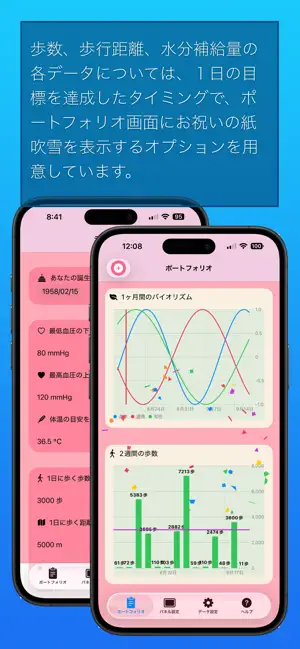 歩数、歩行距離、水分補給の各データでは、一日の目標を達成したタイミングで、お祝いの紙吹雪を表示するオプションを用意しています。