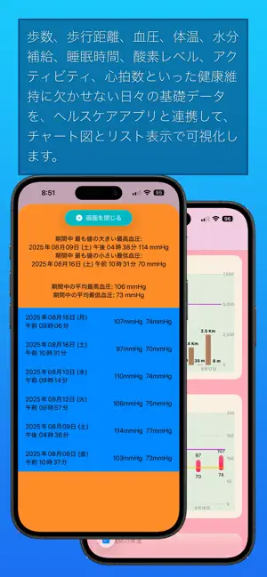 歩数、歩行距離、血圧、体温、水分補給、睡眠、酸素レベルといった健康維持に欠かせない日々の基礎データを、ヘルスケアアプリと連携して、チャート図とリスト表示で可視化します。血圧と水分補給については、2種類のチャートから選択することができます。