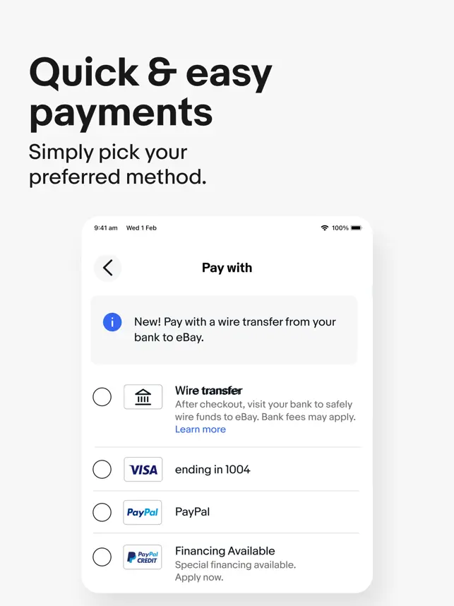 Explore quick and easy payment options We make it easy to pay for the things you want in an instant. Simply store your preferred payments safely and securely so you can check out in a flash!