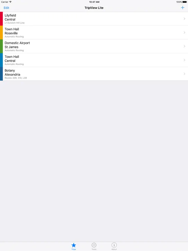 TripView displays Sydney, Melbourne, and Brisbane public transport timetable data on your phone. It features a summary view showing your next services, as well as a full timetable viewer. All timetable data is stored on your phone, so it can be used offline.
