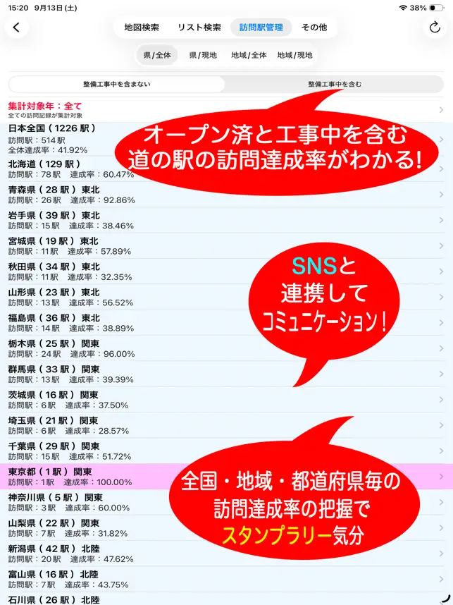 1. ア‏プリ‎の「訪問駅管理タブ」 → 「記念きっぷ購入達成率」に進むと、都道府県毎、地域毎に記念きっぷの購入状況が把握できま‏す‎。