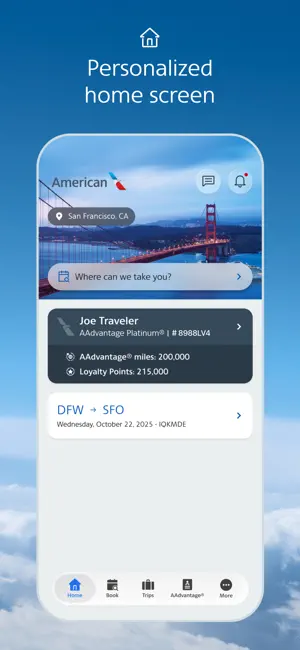 - Personalized home screen: See your next trip, AAdvantage® status, miles and Loyalty Points.