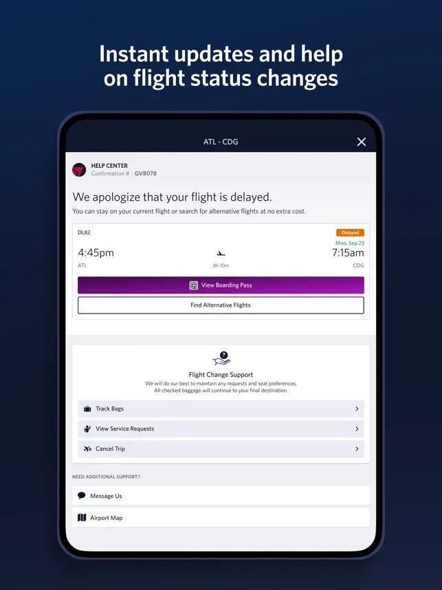• Pay for checked bags and track their location • Check the latest flight status and receive flight and gate change notifications • Save a photo to remember your parking spot • Check your status on the upgrade or standby list • View or change your seat • Locate Delta Sky Club® lounges • View interactive airport maps, public transportation details and weather information • Get detailed info about our fleet and partners • Map flights en route with an interactive flight tracker • “Today” gathers everything you need for your day of travel into one convenient place • “Notifications” ensures you always have the latest flight updates, gate changes and more • View countdown to departure and arrival along with gate and baggage carousel information on Apple Watch