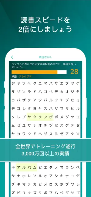 - 読書速度の著しい向上 - 脳の活性化 - 数字、文字や単語の迅速な認識 - 柔軟な目の動き - 集中力の向上 - 認識視野の拡大 横書き文章の読み取りや、メール処理に時間がかかりすぎると感じていませんか?すぐに、ネット版の新聞やいろいろなサイトを短時間で理解し、横書き文章の読書量を増やすことができるでしょう。 トライアルユーザーは、10日内に読書速度を平均143%上げました。 この革新的なアプリは、最小限の労力で測定可能な結果を達成するための理想的なプラットフォームを提供します。一度のダウンロードで英語を始め10ヶ国語以上の外国語にも変換でき、外国語の速読トレーニングにも役立ちます。 速読コーチのバックビンケル先生が、あなたのレベルに合わせた個別トレーニングプログラムを用意します。 また、あなたの強みと弱みを認識する統計機能により、上達状況を確認することができます。 各トレーニングエクササイズの結果はグラフ化され、目標達成度が一目で分かります。 トレーニングのひとつであるパワーリーダーは読解力を鍛えます。トレーニングの途中のリーディングテストで、読書速度を確認することができます。また、このテストはあなたの記憶力と理解力も評価します。これらを組み合わせることにより非常に速い読書速度、効果的な読解力、そして高い記憶力を習得できます。 ご注意:このアプリの効果が、あなたにやる気を起こさせ夢中にさせてしまうかもしれません。それは楽しく同時に脳の活性化にもなるのです。 おすすめ:最良の結果を得るためにトレーニングは過度ではなく、定期的にすることをおすすめします。 こんな方に最適: - 毎日30分以上読む。 - しばしば読むことに時間がかかりすぎると感じている。 - 何かが明確ではなかったので、前の段落に戻り読むことがある。 - 読書中、注意が散漫になりがち。 - 読んだ内容を思い出すことを難しいと感じる。 - 英語、あるいは他の外国語の読書速度を上げたい。 さあ、今すぐダウンロードして速読のプロを目指しましょう。 Apple Terms of Use (EULA) – https://www.apple.com/legal/internet-services/itunes/dev/stdeula ご利用規約 – https://readingtrainer.com/sokudoku/riyoukiyaku 個人情報保護方針 – https://readingtrainer.com/sokudoku/kojinjoho-hogohoshin