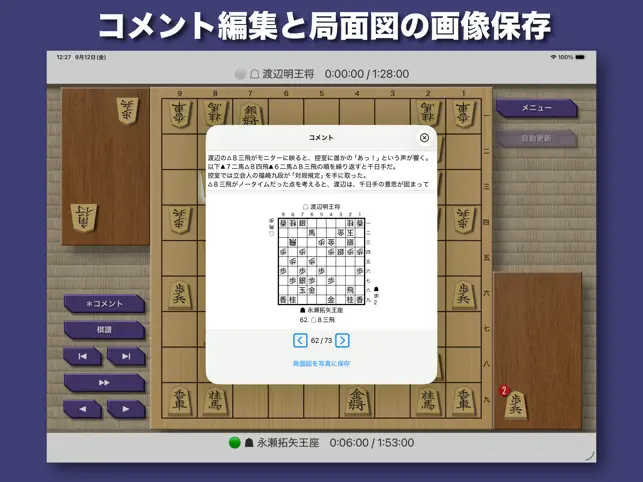 ・棋譜や局面図をペーストボードにコピーしたり、将棋盤にペーストすることが出来ま‏す‎。