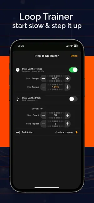 • Practice at your pace by easily adjusting tempo without affecting pitch, with amazing HQ audio quality down to 0.05x