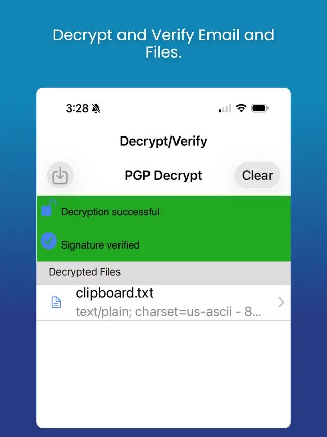 * Directly from the system clipboard. Copy-and-paste the PGP message text from any file, webpage, or message, and it can be imported and decrypted by the app.