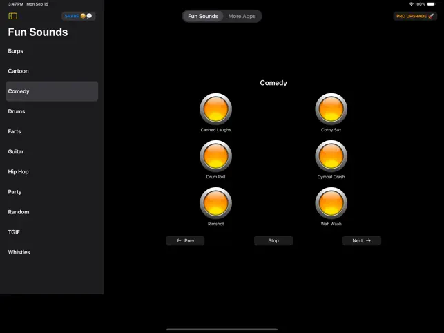 - 2x - wet Cartoon sounds - angry chipmunk - banana peel slip - boing - frying pan impact - jiggle - noise machine Comedy sounds - canned laughter - corny sax - drum roll - cymbal crash - rimshot - wah wah wah waah Drum sounds - crash - hi-hat closed - hi-hat open - ride - snare - tom Fart sounds - lawn mower - sharp - short ripper - string cheese - wet - windy Guitar - double picked slide - pick slide - string noise - string whip - squeal - triplets Hip hop - lead - beat - didgeridoo - funk - scratch - synth Party noises - airhorn - bottle rocket - cork pop - didgeridoo dance - fireworks - trance Random fun sounds - cuckoo clock - magical - no slo-mo - ricochet - ant march - mouse organ TGIF - TGIF - Friday rocks! - Let me out! - Om - Yes! - Woohoo! Whistles - bongo - pretty girl - ref - slide down - slide up - whee Thanks for downloading Fun Sounds! If you enjoy the app please leave a happy review. Thanks!