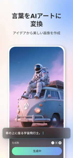 ‒ テキストを驚くほど美しい画像に変換します!「キッチンでパンを焼く魔法使い」や「バーでスパイダーマン」といったように、やりたいことを説明し、スタイルを選ぶだけで、アイデアを数秒で現実に変えます。