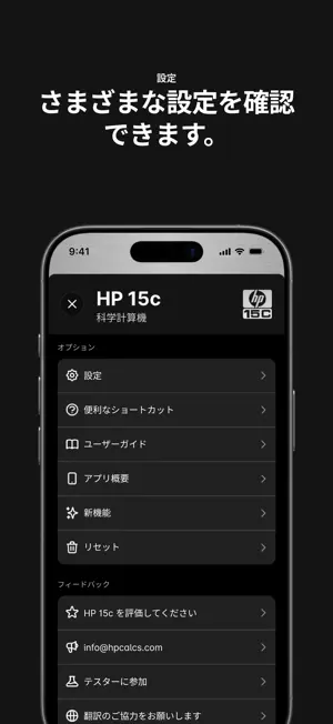 The HP 15c You Know - Now Better Than Ever - HPによる伝説の電卓デバイスの公式エミュレータ - オリジナルのHP 15cと同一のアルゴリズム、レイアウト、キーストローク - RPN(逆ポーランド記法)による高速で効率的な入力 - 行列計算、複素関数、数値積分。