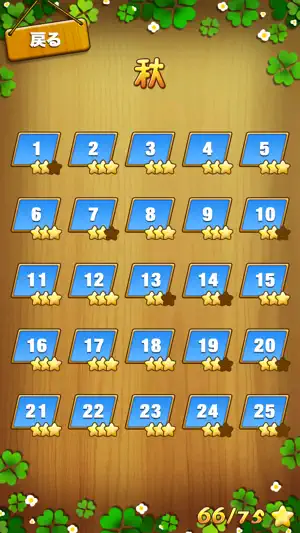 春夏秋冬、四つのステージ。各ステージで25のレベルがあります。レベルが進むごとに、ツールも多くなって、ゲームも面白くなって、当然、難易度もね!各レベルを完了すると、レートを御願いします。星が待っていますよ!