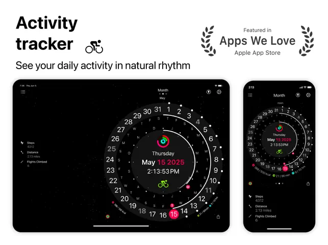 円形ビューはひと目で明快さを与えてくれま‏す‎。一日の始まり、光が消える時、ルーティンの収まり方、休息が訪れる時が見えてきま‏す‎。混乱は減り、集中力は増す。ついに時間そのもののように感じられるカレンダーで‏す‎。