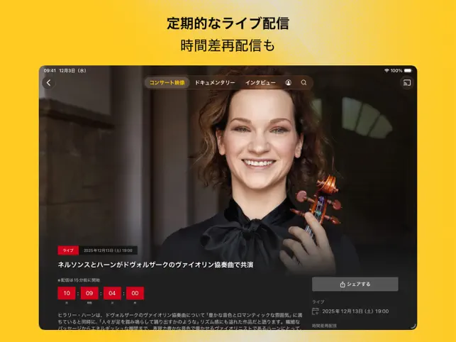 デジタル・コンサートホールでは、常に最高の環境でコンサートをお楽しみいただけます!毎シーズン40以上のコンサートがライブ中継され、オンデマンド・アーカイブで視聴可能。クラシック音楽界のスターが出演する数百ものコンサート映像に加え、インタビューやドキュメンタリー映像、プレイリストもご覧いただけます。