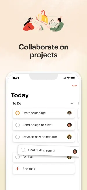 シンプルにタップするだけで、タスクの追加、リマインダーを設定。複数の画面(カレンダー、リスト、ボード)が使える。仕事や私生活でタスクをフィルタリングし、プロジェクトでコラボレーションして、心の平穏を手に入れましょう。