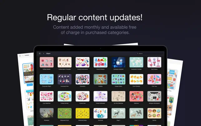 • Graphics: backgrounds, badges/ribbons, bullets, clipart & icons, frames, patterns, shapes