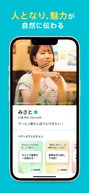 社会心理学者との共同研究で生まれたペアーズクエスチョンは恋愛の相性判断に効果的な質問です。質問に回答するだけで、人となりを自然に表現できるマッチングアプリです。
