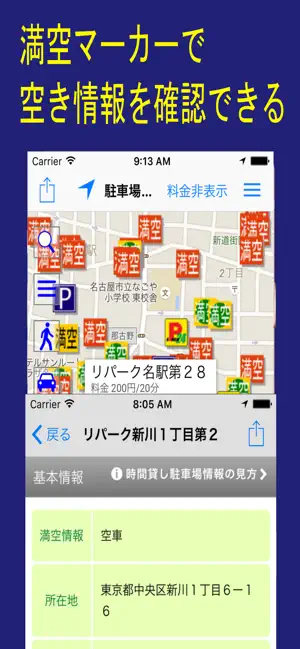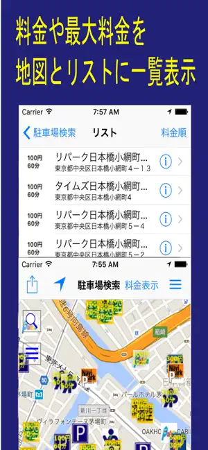 駐車料金を計算(料金シミュレーション)して安い順位で地図上に表示します。画面の切り替えなくルート表示、どんな場所なのか画像で確認できます。空きを確認できる駐車場は満空のマーカーで表示します。