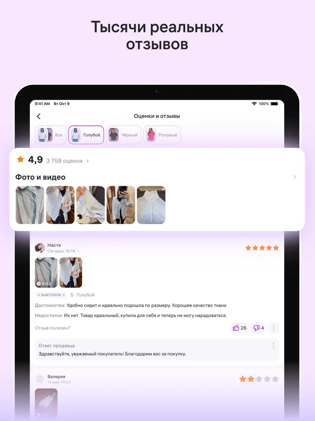 • Находите именно то, что хотели, и даже больше — в приложении можно настроить фильтры по цене, рейтингу и популярности. Сортируйте по размеру, бренду или цвету. Ищите похожие вещи по кнопке на фото товара и в рекомендациях.