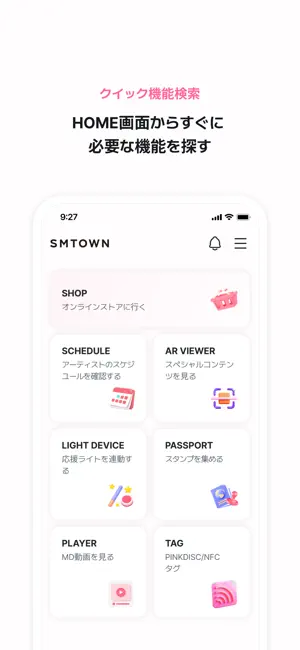 ● PASSPORT コンサート、ポップアップストアを楽しむもう一つの方法 デジタルスタンプを集める ● AR VIEWER SMTOWNのARコンテンツを楽しむ特別な方法 ● PLAYER ビデオプレーヤーでMDを見る ● TAG PINKDISC・MDをタグ付けしてプライベートコンテンツを楽しもう ● SHOP 誰よりも早く出会えるHOT & NEW公式MD SMTOWN A to Z, 新しくなったSMTOWN OFFICIALアプリ、今すぐご覧ください! 利用規約:https://www.smtown.com/policy/terms 個人情報取扱方針:https://www.smtown.com/policy/privacy
