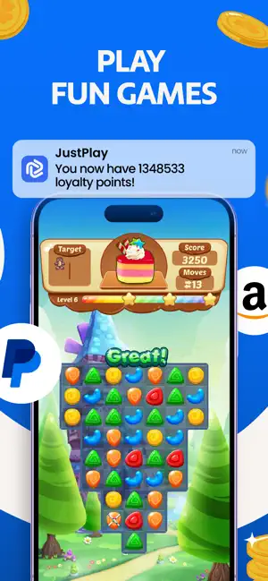 • REDEEM REWARDS EVERY 3 HOURS With JustPlay, you won't have to wait long to enjoy your rewards. Every 3 hours, you can convert your loyalty points into real-world rewards. In collaboration with global partners like Amazon, PayPal, and Walmart, we ensure your playtime is well rewarded.